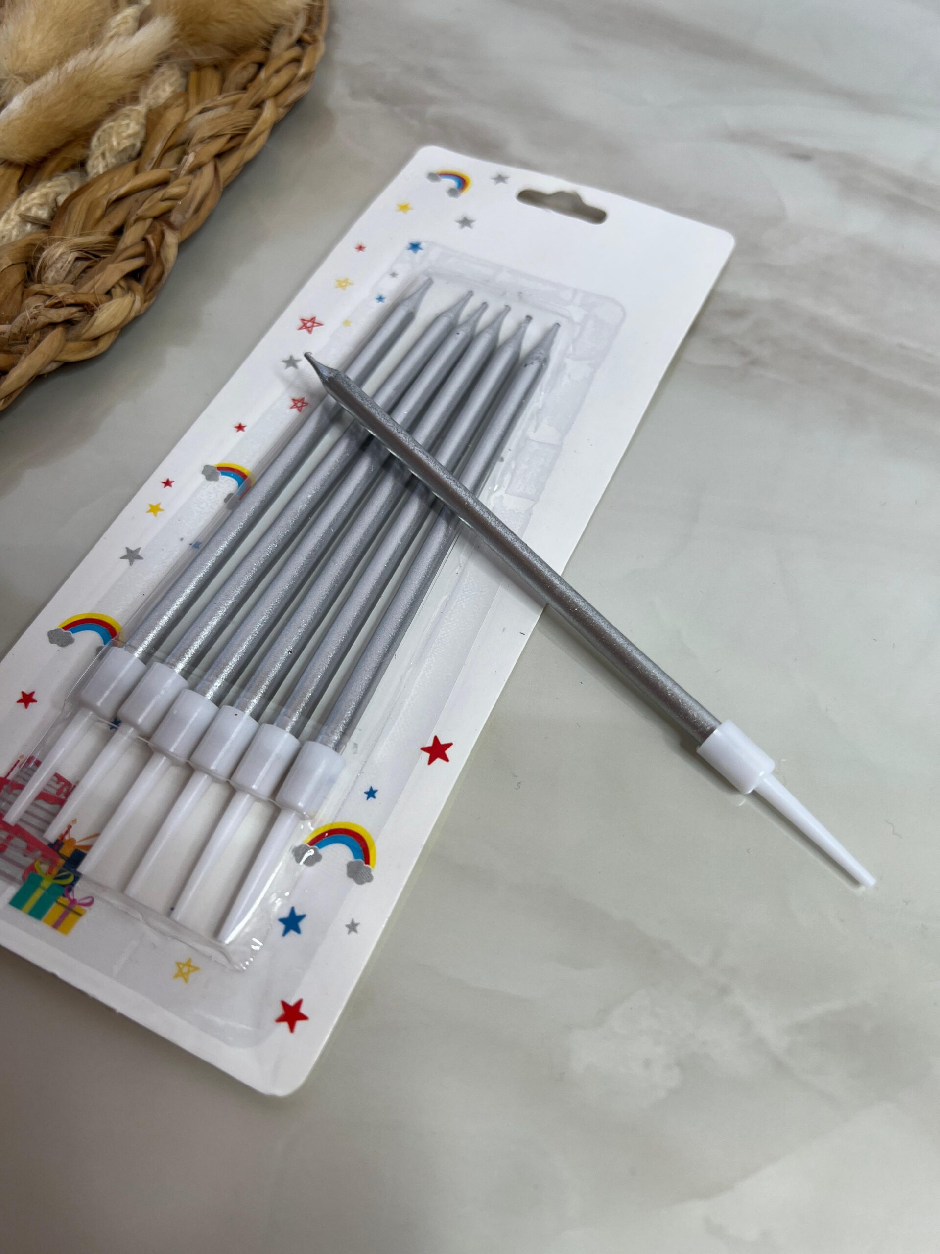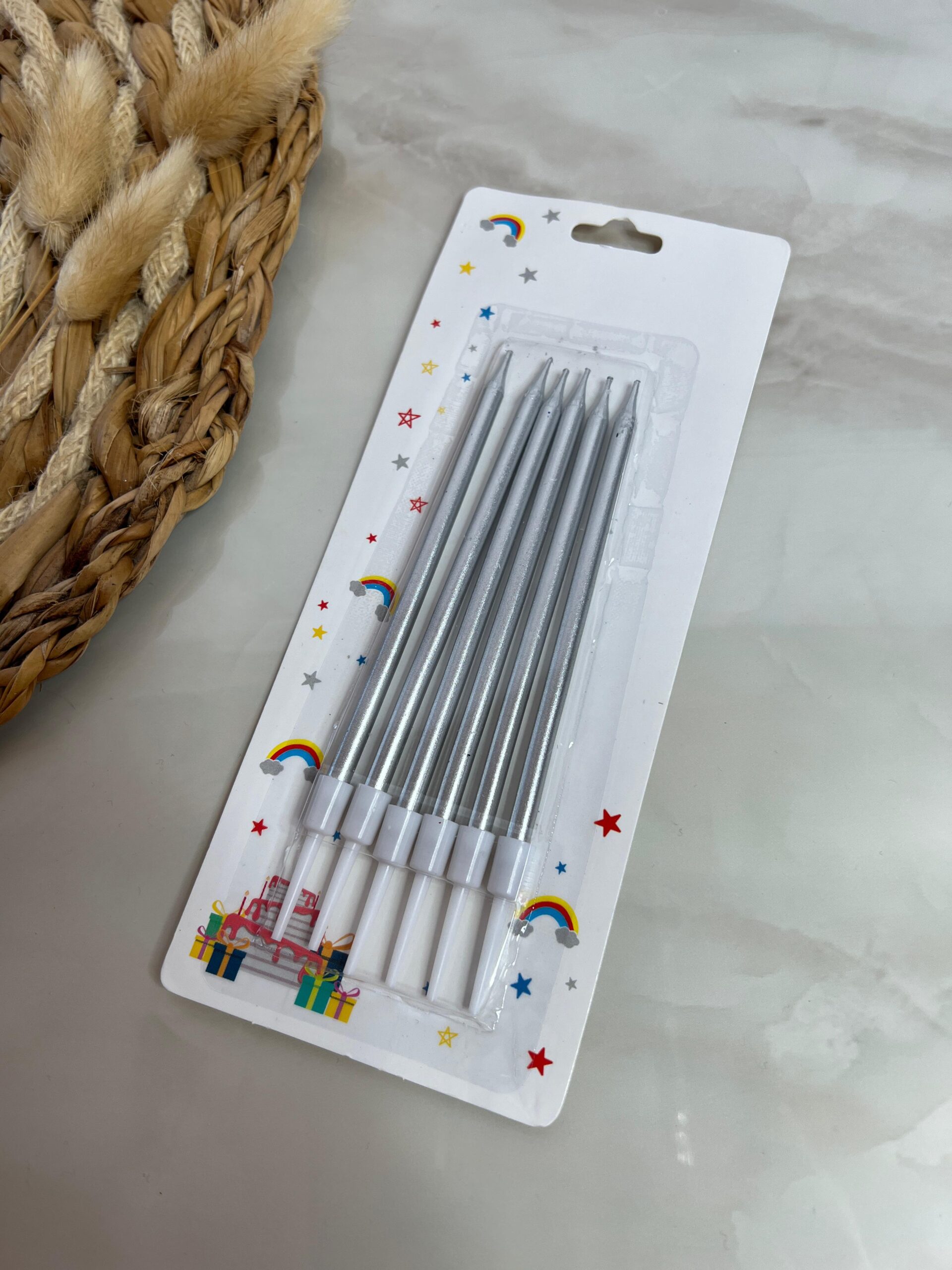 Silberne lange Tortenkerzen – 6 Stück mit Halterung